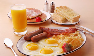 In the United States, a person may sit down for a full hearty meal consisting of American pancakes/waffles with maple syrup, some type of cooked egg (sunny-side up, scrambled, egg benedict), hash brown, sausage/bacon, and toast.