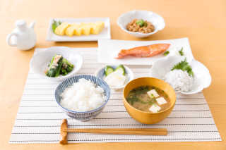 In Japan, a typical breakfast will have a bowl of steamed white rice, miso soup, broiled fish, a vegetable side dish, natto (fermented beans), and some pickled vegetables. Also the western-style (non-traditional) style of toast, eggs, and a bowl of salad is also quite popular.